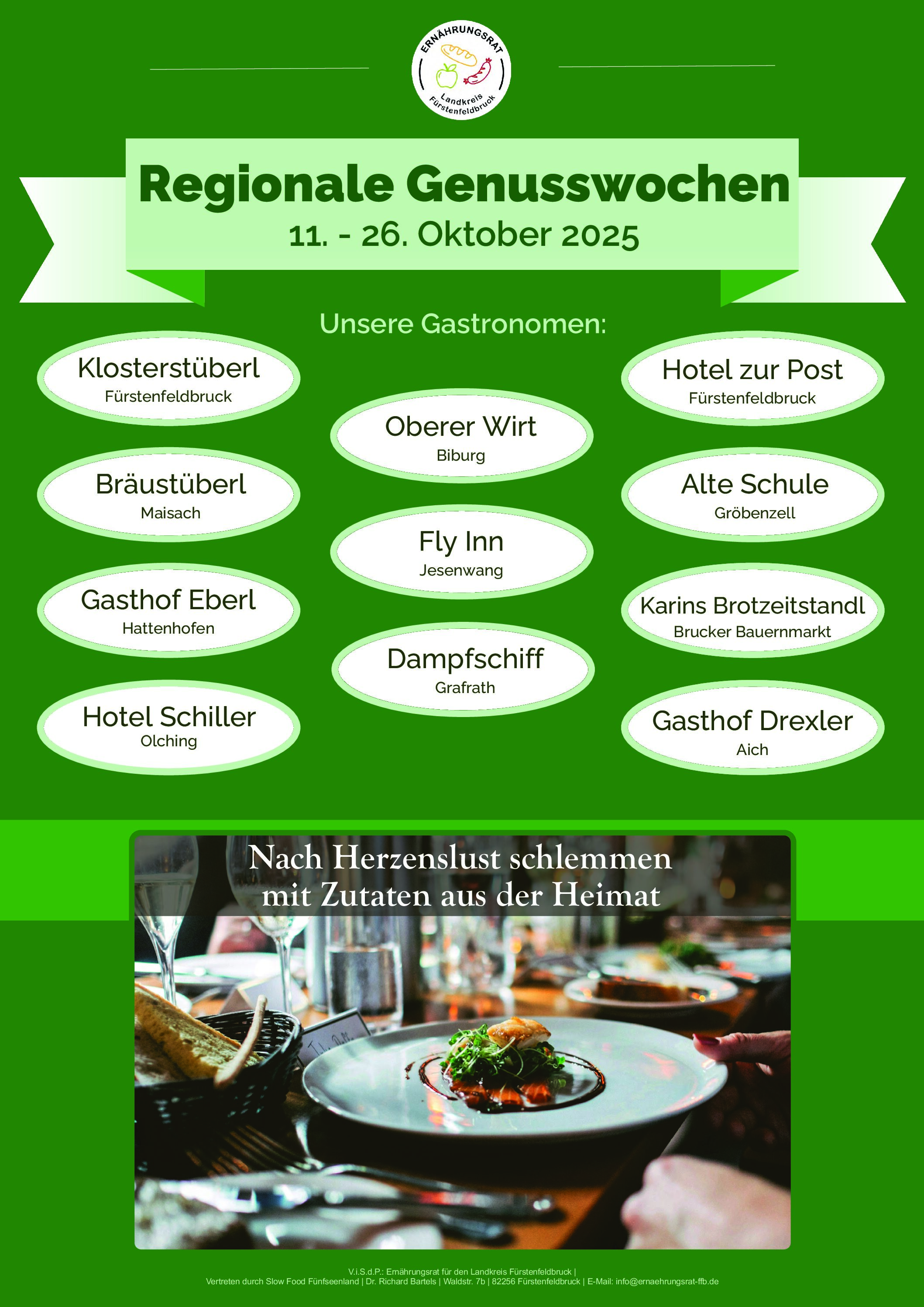 Nachhaltigkeitstag 2026: „Du bist, was du isst – gesunde Ernährung, gesunde Menschen, gesunde Erde“ Sonntag, 26. April 2026 in der Friesenhalle Eichenau Programm: Freitag, 24. April 2026: Einstimmungsabend mit Monika Drasch Samstag, 25. April 2026: Aufbau Sonntag, 26. April 2026: Nachhaltigkeitstag mit Ausstellung und Vorträgen (Friesenhalle, großer und kleiner Saal)
